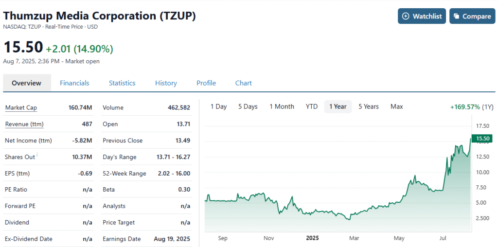 First, last October ,some Investment Banking friends of ours at Dawson James, do a small $7M raise and uplists them to NASDAQ. Thumzup Media Corp Lists Shares on Nasdaq and Prices Upsized Public Offering of Shares of Common Stock to $7,125,000