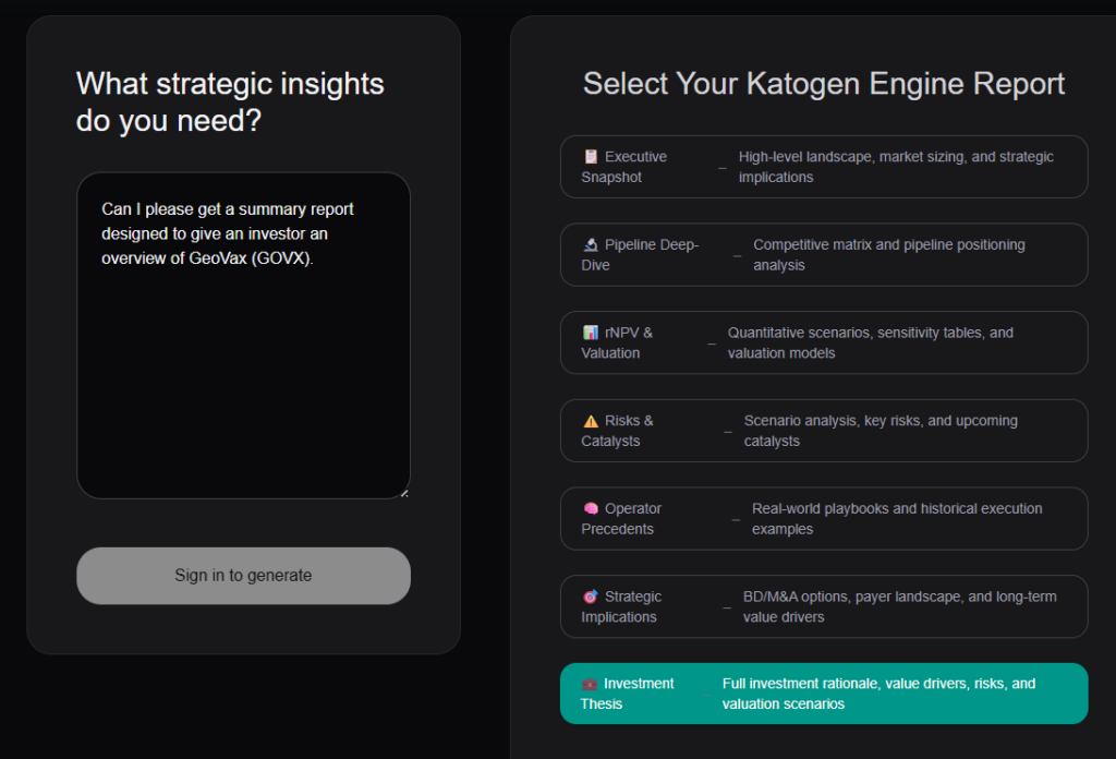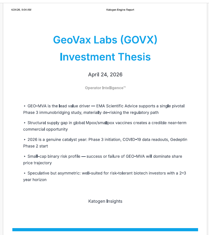 The Engine is a rapid strategic intelligence tool built for biopharma. Query an asset, a deal structure, a reimbursement scenario, a competitive position. Get a structured, rigorous report in about a minute. This runs alongside Katogen’s bespoke advisory practice, which is grounded in 35 years of biopharma operator experience, and two decades in the CEO seat.