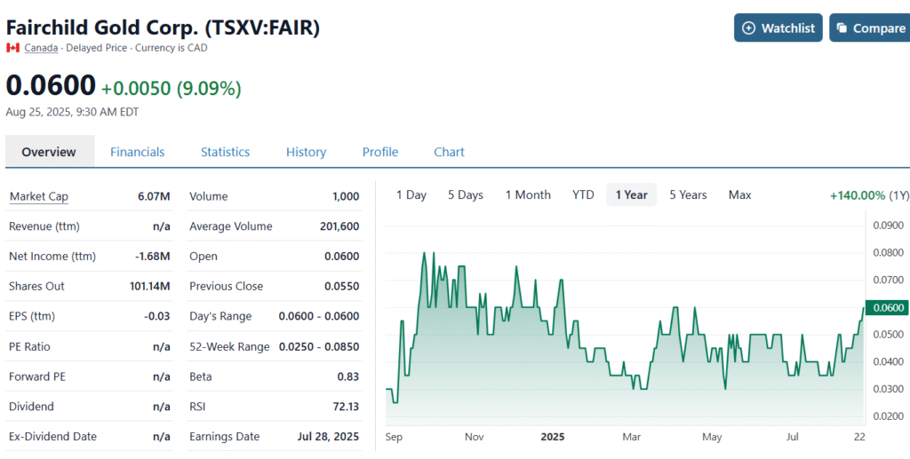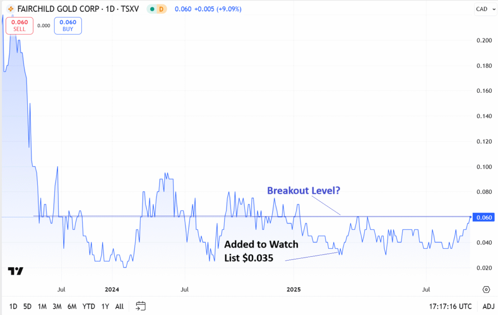 We added Fairchild Gold (FAIR) to the Watch List at $0.035 after speaking with management. In short they have assembled the “dream team” of experts – which sounds funny talking about a six-cent stock, but that’s how they do things in Canada. And Australia and we’re not complaining.