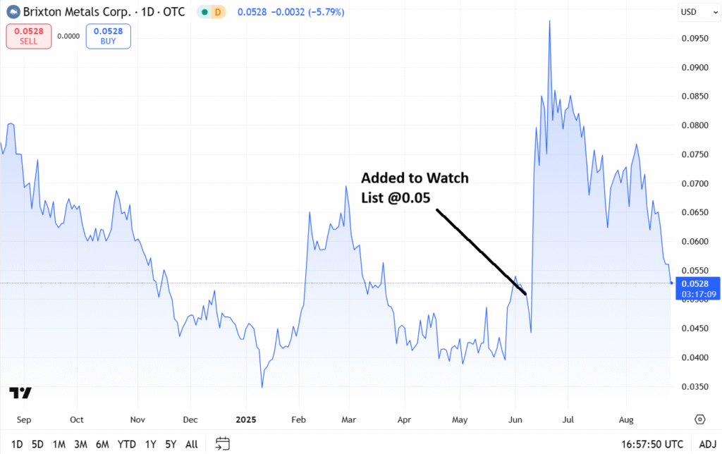 June 10th, 2025: Adding Brixton Metals (BBBXF) $0.05 to the Watch List.