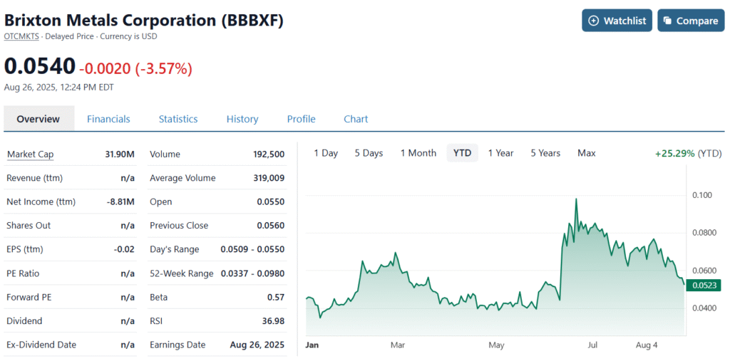 June 12th, 2025: Brixton Metals (BBBXF) $0.072, Leaps 62%. On No News.