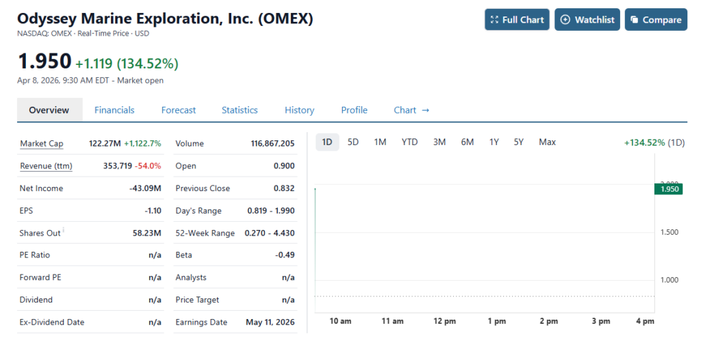 April 8th, 2026: Odyssey Marine (OMEX) Gains 169% on Merger News